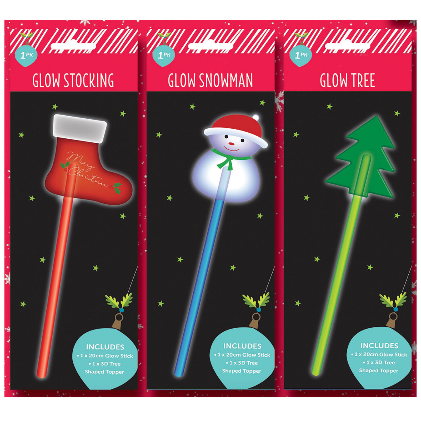 Includes 1 x Stocking Glow Wand, 1 x Snowman Glow Wand, 1 x Tree Glow Wand