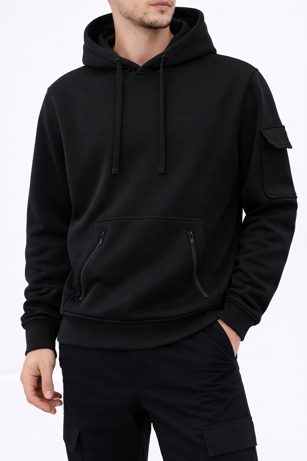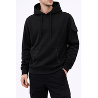 The classic pullover style features an adjustable hood and ribbed trims, finished with a single front kangaroo pocket with two zip openings for secure storage. A utility pocket on the sleeve adds a subtle functional detail.