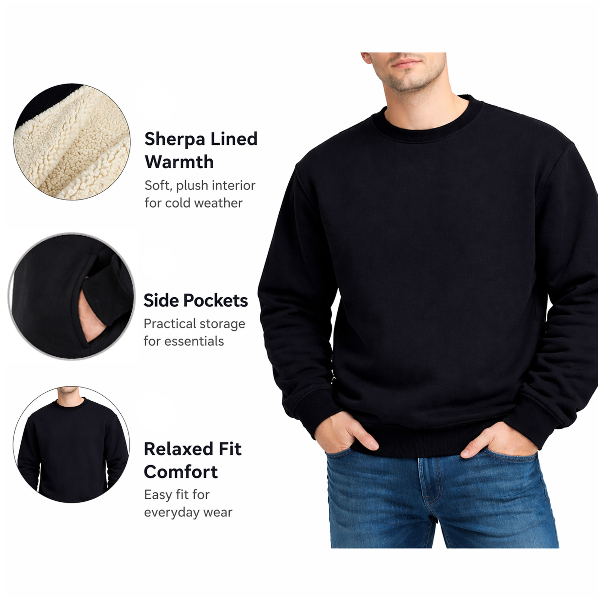 FIL Mens Sherpa Lined Jumper Warm Fleece Sweatshirt Crew Neck Pullover Pockets [Size: S] [Colour: Black]