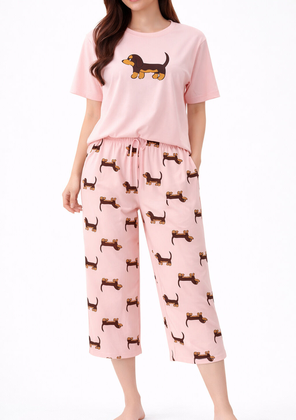 Dachshund Print Pyjama Set - Short Sleeve Top & 3/4 Pants