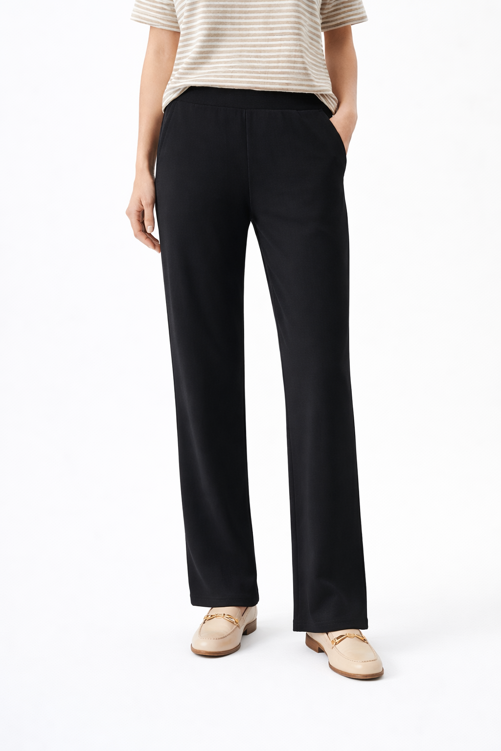 These straight-leg pants are Coloured for effortless, everyday wear. Featuring a clean silhouette and comfortable elastic waistband, they offer a flattering fit while remaining easy to move in throughout the day.