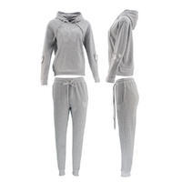 Women's hoodie and track pants set with embroidery and 3D applique designs.