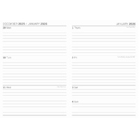 Each week is spread across two pages in a convenient Monday-to-Sunday layout, making it easy to plan appointments, tasks, and reminders.