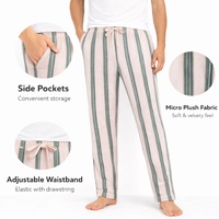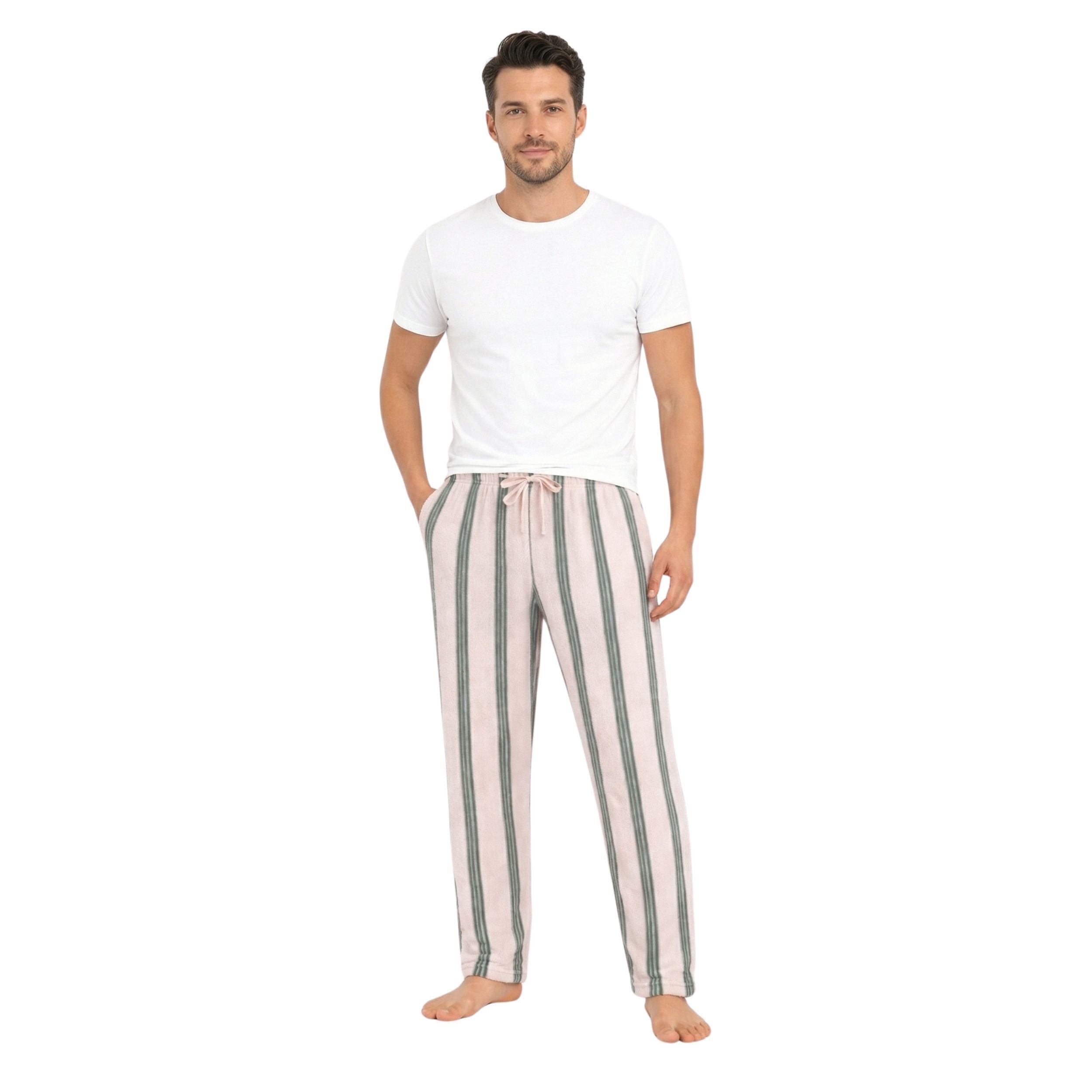 Men's Soft Plush Lounge Sleep Pyjama Pajama Pants Fleece Winter Sleepwear [Size: M] [Design: Sand Green/Stripe (Pockets)]
